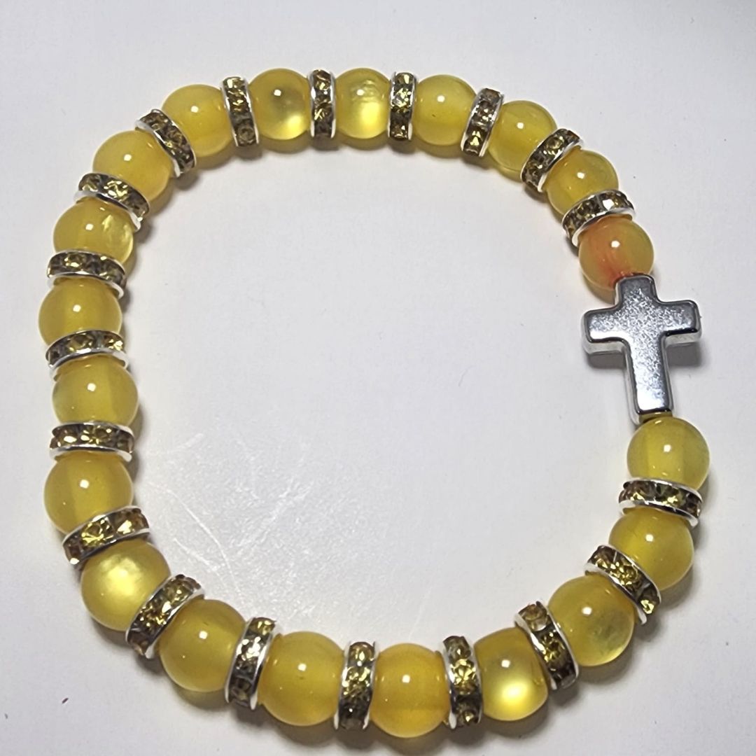 / Yellow Bracelet with Rhinestones and Silver Cross